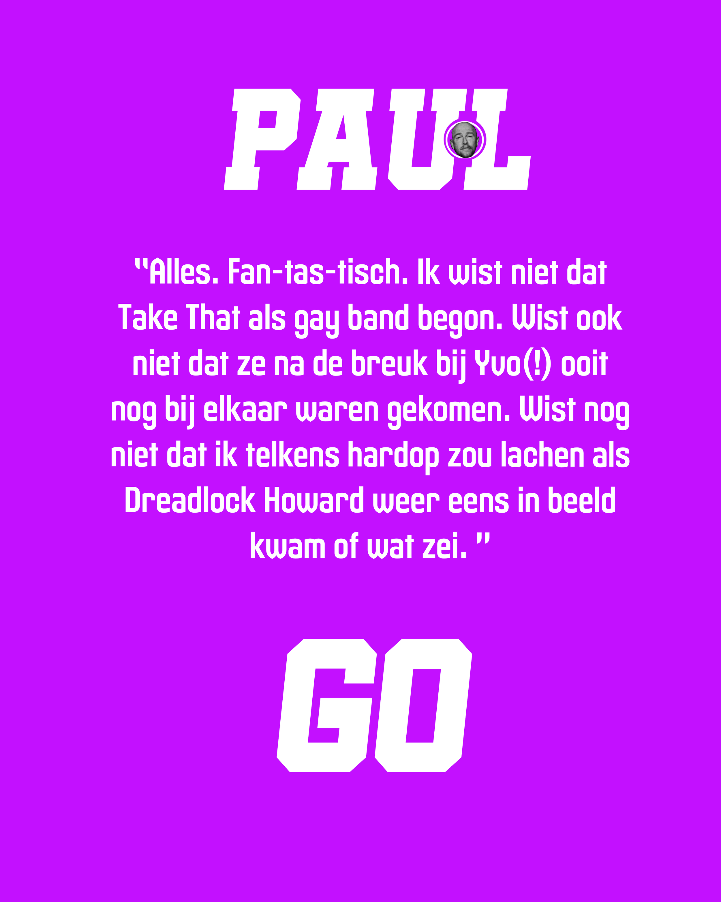 In TAKE THAT vertellen Gary, Mark en Howard hun versie van het Take That-verhaal: eerlijk, gecontroleerd en met net genoeg emotie om te bewijzen dat ze er écht iets van hebben gevoeld. Robbie is vooral aanwezig als herinnering, archiefbeeld en subtiele schaduw, terwijl de overgebleven drie laten zien hoe volwassen worden eruitziet als je jeugd wereldwijd is meegezongen. Het resultaat is een strak gemonteerde trip langs successen, breuken en wederopbouw…met veel zelfreflectie, weinig sensatie en de stille boodschap dat overleven in een boyband vooral betekent: leren praten vóór iemand weer opstapt.